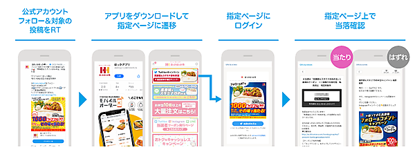 木嶋: はい。そこで2021年8月の施策では、「echoes」のサービスのラインアップとして、新たにリリースした「echoes App(エコーズアップ)」を使いました。これは先ほどのインスタントウィンの施策と似ていますが、違いはTwitterでほっかほっか亭さんのアカウントをフォロー&RTしていただいたあとに、アプリ上でキャンペーンの当選結果を表示させる仕組みになっていることです。お客様がアプリをダウンロードして、Twitterアカウントと連携させることで、クーポンの当選結果がわかるようになっています。当選結果をTwitter上で完結させず、「ほっかアプリ」に誘導させたことで、必然的に会員数が増えました。