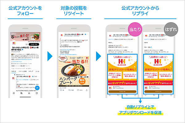 木嶋: キャンペーン施策では、ほっかほっか亭さんのTwitterアカウントをフォローしていただき、キャンペーンの投稿をリツイートしてもらうことで、クーポンの当選結果を即時に自動でリプライしています。さらに自動リプライ上でアプリダウンロードを促進する(任意)ことも実施いたしました。キャンペーンのインセンティブではお弁当を無料で1食引き換えできるクーポンを配布しているため、課題に感じていた新規のお客様に「ファーストステップを踏んでいただく」ことのハードルを下げられたと思います。