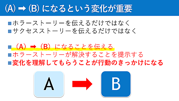 そこで西脇氏が提案するのが、その真逆の「ホラーストーリー」だ。提案したいものが導入される前の物語であり、「こんなふうに困っていて、大変だ」という課題提起から、「この〇〇を使用しないとどうなるか」「なぜ〇〇が必要なのか」という解決策を紹介する流れにする。「まずは相手の課題をなぞり、そのうえで解決策を示す。ホラーストーリーを伝えるだけでなく、サクセスストーリーにつなげていくことが大切。AだったことがBになるという“変化”を理解してもらうことで、行動につながる」と西脇氏は説明した。