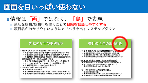 そして、スライドの作り方としては、「画ではなく島」がコツだという。PowerPointの場合、スライド画面を情報で埋めてしまいがちだ(下図左)。しかし、適切な余白と空白行を付け、項目名がわかりやすいように文字の大きさを変化させ、メリハリを付けたほうが目線誘導しやすくなるし、理解しやすい(下図右)。