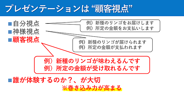 これを実際に行うには、自分視点から顧客視点に変えて言葉にすることが重要になる。たとえば、「新種のりんごをお届けします」は自分視点だが、「新種のりんごを味わえるんです」といえば、顧客視点になる。「誰が体験するのか」が大切であり、それによって巻き込み力を増すことができる。
