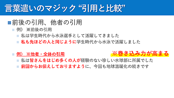 他にも、他者や他の引用によって、巻き込み力を高めるテクニックもある。自己紹介で「私は学生時代から水泳選手として活躍してきました」と話すのと、「私も先ほどの人と同じように、学生時代から水泳選手として活躍してきました」とでは、印象が変わるのがわかるだろう。