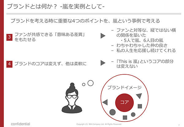 嵐のアウトプットの優れた点を例に、まずはマーケティング戦略を考えるうえで重要となる「ブランディング」について、4つのポイントを挙げた。