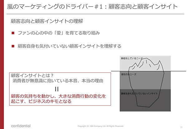 嵐はニーズとインサイトの両方を理解して、毎年新しい嵐の世界を創りあげた。たとえばライブでは「わちゃわちゃした仲良しの嵐が好き」「可愛い嵐が好き」「嵐を近くで見たと感じたい」というニーズに応えたコンテンツや見せ場を提供した。
