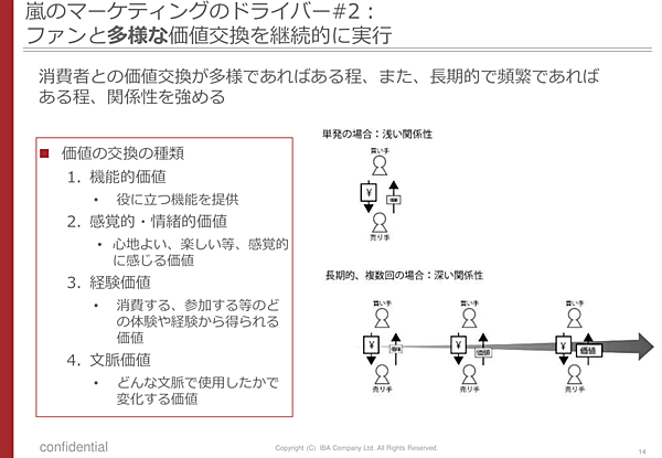 射場氏は「いちファンとしての実感も入れてですが」と言いつつ、「ファンを喜ばせることを第一に考えた活動・行動が中心となっているのが嵐の強みであった」と話す。マーケティング的な観点でいえば、「顧客を理解し、喜んでもらおうと努力し続けること」が真の顧客志向であり、顧客側もこれに対してロイヤリティという愛情的なものを積み上げていく。