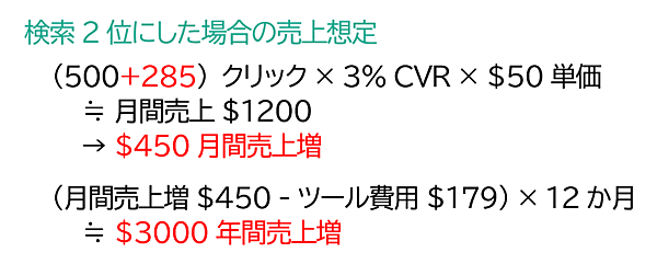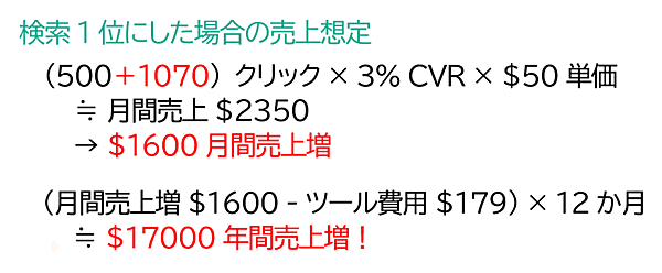それが実際に可能なら、オーガニック検索のクリック率は大幅に増加するし、コンバージョン率とウィジェットの価格が同じなら、検索3位だった場合と比べて1か月あたりの売上は約1600ドル上乗せされる。ここでもツールのコストを差し引くと、1年あたりの売上は約1万7000ドルになる。