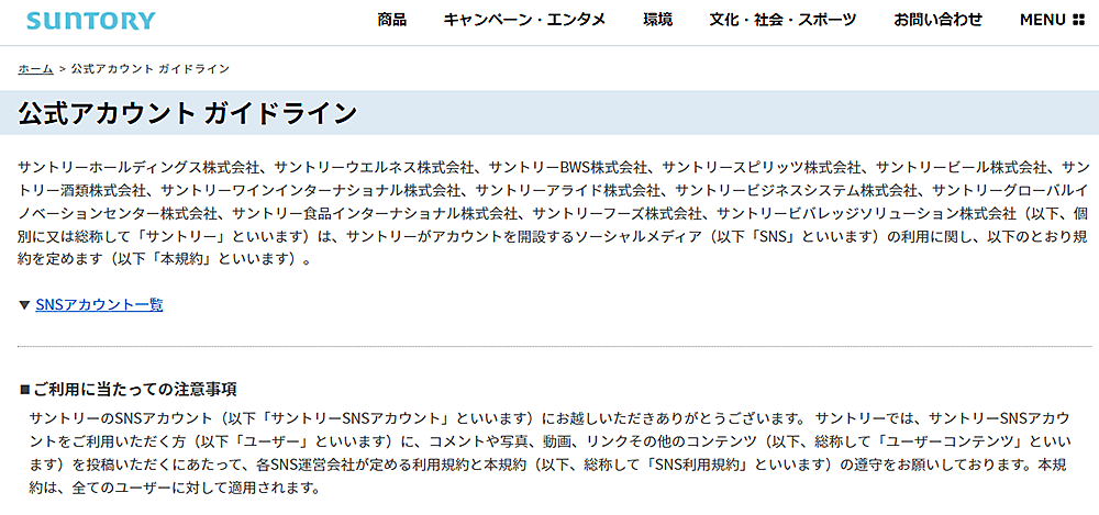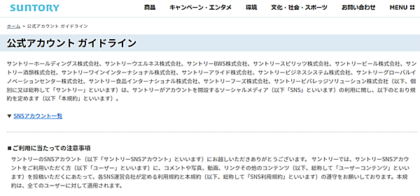 サントリー:自社のアカウントについてのガイドライン