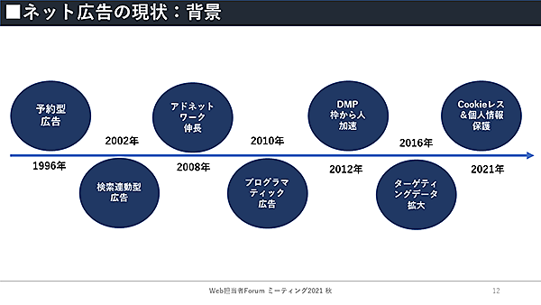 2010年に入るとプログラマティック広告が登場し、枠とクリエイティブが多対多の関係で取引が進み、2012年にはDMPが登場、ターゲティングデータが拡大し、「広告枠から人へ」の動きが加速した。