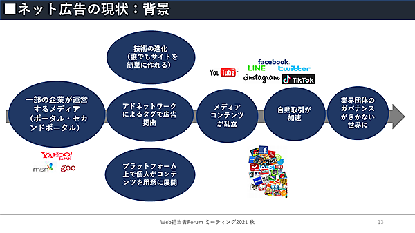 これが技術の進化により、誰でも簡単にサイトが作れるようになるとサイトが増え、アドネットワークのタグを貼るだけで誰でも広告を掲出できるようになった。メディア・コンテンツが乱立し、モバイルアプリも爆発的に増え、SNSプラットフォームも乱立、自動取引が加速することで業界団体のガバナンスがきかない世界になったといえる。