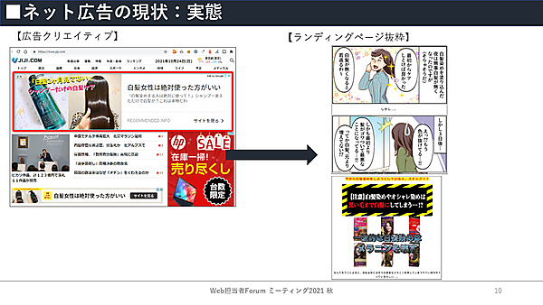 小林氏は、「広告主は、自分たちがどういうメッセージ、クリエイティブを作っているか、気を配る必要がある。オウンドサイトだけでなく中間サイトでも委託を受けた代理店任せにせず、広告主と同じ思いで広告キャンペーンを運用していくべきだ」と提言した。