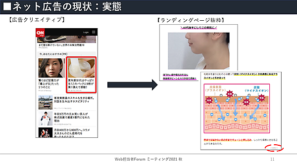続いて、「ネット広告の実情」としてどんなLPやクリエイティブが存在しているかが示された。一つ目はネットユーザーおなじみの「角栓」の広告だ。