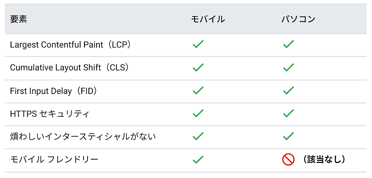 おさらいとして確認しておくと、ページエクスペリエンスアップデートでは、次のシグナルをランキング要因に用いる(これらのシグナルをまとめて「ページエクスペリエンス シグナル」と呼ぶ):