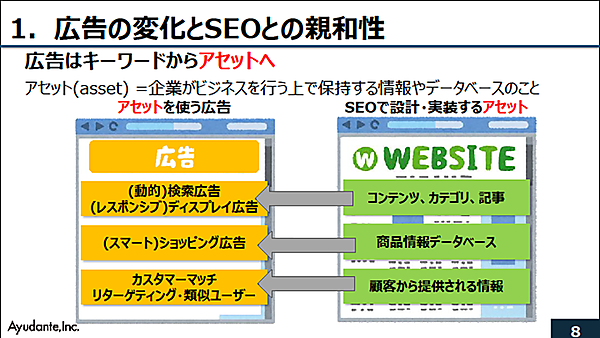 これらの広告は、SEOで設計するアセットが活用されている。「アセット」とは、企業やWebサイトが保持する情報やコンテンツなどのデータベースのことだ。SEO施策として、商品データベースや商品ページなどを最適化していくと、広告にとっても好影響が及ぶのである。つまり、親和性が高まっているというわけだ。