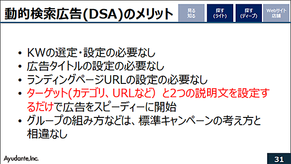 キーワードの選定・設定が不要で、広告タイトルの設定やランディングページURLの設定も必要ない。ターゲット(カテゴリ、URLなど)と2つの説明文を設定するだけで広告を素早く始められる。Google、Yahoo! でも一定の効果が出ており、カテゴリ階層がきちんとしているECには向いている広告である(河野氏)