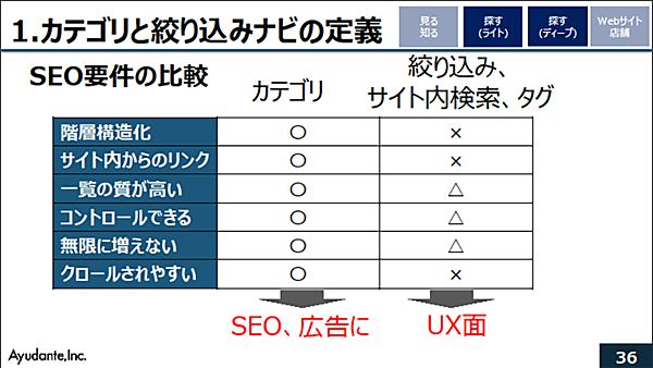サイト内検索やタグは、基本的にはフラットな構造であるのに対し、カテゴリは階層構造が明確であり、パンくずリストやリンク構造の設計がしやすい。さらにカテゴリはサイト内からのリンクが容易で、手動でコンテンツを登録するので一覧ページの質が高い。一方、絞り込み検索などでは、検索軸で無限にページが増えてしまうのでコントロールしづらく、動的生成も多いためクロールされにくい(江沢氏)