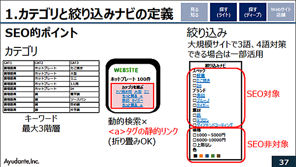 カテゴリはできるだけ名称にキーワードを使い、最大三階層に収めること。特に三階層目をしっかり細分化すると、キーワードが増え、広告のランディングページにも活用できるという。そしてリンクでは、JavaScriptをクロールできるものの確実ではないため、<a>タグの静的リンクでカテゴリリンクを設定しておくといいだろう。