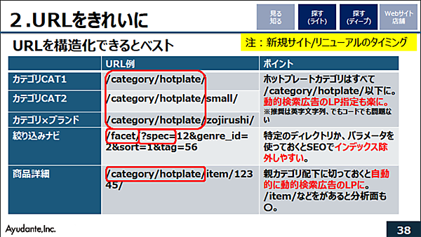 2つ目はURLについてだ。URLは構造化できるとベストだが、SEO観点では“URLの歴史”も重要なので安易に変えるべきではないという。新規サイトやリニューアル時に見直そう。江沢氏はカテゴリの整備例をスライドで示した。