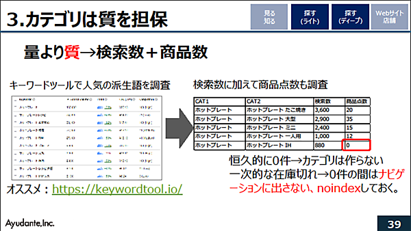 近年のSEOは量より質になっており、検索数+商品数が重要になる。そこで、キーワードツールで商品に関連する人気の派生語を調査し、さらに該当する商品点数を調べてみるとよい。恒久的に0件ならばカテゴリは作らず、一時的な在庫切れの場合は、ユーザーに見せないようにナビゲーションにリンクを出さず、noindexを設定しておくと0件ヒットのページがユーザーの目に触れることがなくなる。