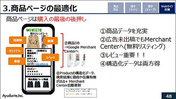 商品ページの最適化では、画像など商品データを充実させることが大切だ。アイテムキーワードで最上部に出るショッピング広告に、数年前から無料リスティングも行われているので、広告出稿していなくても、商品データはGoogle マーチャントセンターに送ると良いだろう。