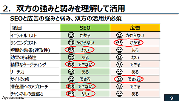 次に江沢氏はSEOと広告の強み・弱みの一覧表を示した。