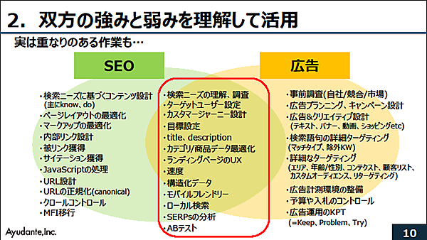 下図は、SEOと広告で行う業務内容を示した図だが、下図の赤枠部分は、検索ニーズの理解や調査、ターゲットユーザーの設定など、SEO、広告の双方で作業が重なるものだ。両者の連携により、より効率的に高い効果を出せる可能性があると江沢氏は言う。
