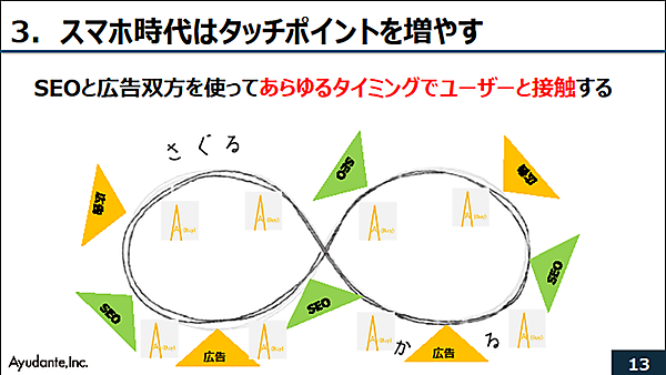 SEMが複雑化し、SEOと広告、それぞれが単独で持続的な効果を得ることは難しくなっている。SEO×広告で、双方を活用しユーザーとのタッチポイントを増やしていくことが重要だ。