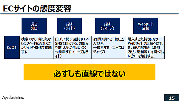 たとえば、SNSのタイムラインに動画広告が出てすぐに購入する「パルス消費」が発生したり、欲しい商品を探してライト&ディープ検索して最終的には店舗に見に行ったりと、ユーザーの購入に至る態度変容は予測ができない。予測できないながらも、態度変容を前提に最善の打ち手を考えるのが重要だと江沢氏は言う。