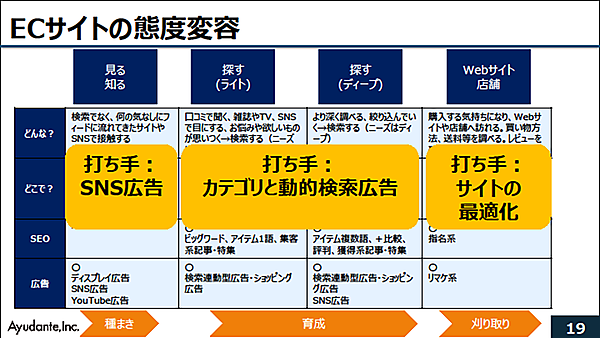 では、各ステップでどのような打ち手が有効なのだろうか。「①見る・知る」ではSNS広告、「②③探す」ではカテゴリと動的検索広告、「④Webサイトや店舗への訪問」ではサイトの最適化という打ち手を江沢氏は紹介し、それぞれのポイントを解説していった。