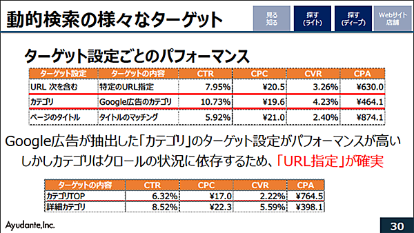 次に河野氏は動的検索広告でのターゲット設定ごとのパフォーマンス結果を示した。「URLの文字列の中に『次の文字列を含む』としたケース」「Googleが抽出してきたカテゴリを設定したケース」、そして「ページタイトルの中に含む文字列を設定したケース」の3つを比較したところ、クリック率(CTR)、クリック単価(CPC)、コンバージョン率(CVR)、コンバージョン率(CVR)、コンバージョン単価(CPA)ともに「カテゴリを設定したケース」が最も高く、効果的だという結果になった。