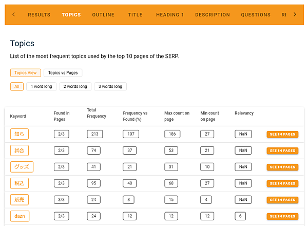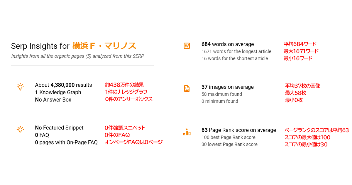 これらすべてに合致させる必要はないかもしれないが、特定のキーワードに対してすでにグーグルで表示されるようなページのタイプについて、優れた統計情報が得られる。