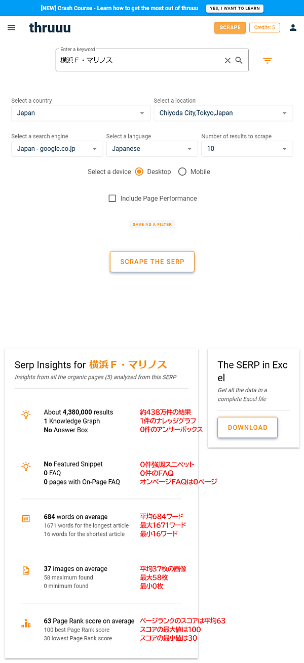 Thruuuは要登録でメールアドレス確認が必要だが、日本語キーワードでも問題なく扱えるようだ。無料でも月間10回まで調査できる。