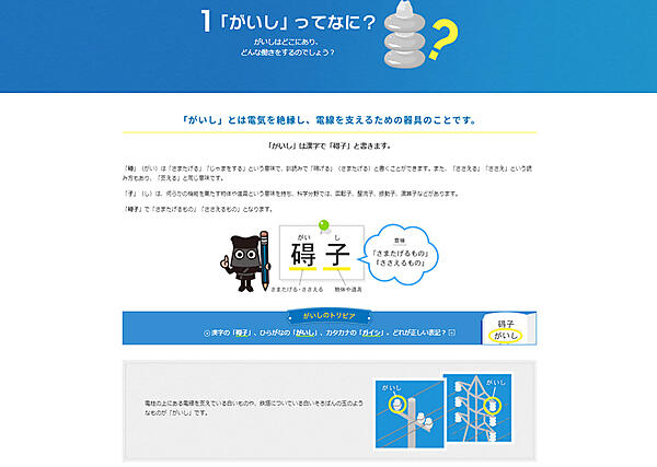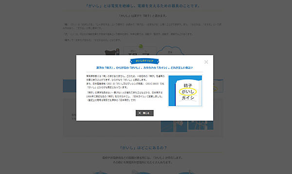 Webサイト『「がいし」とは』は、がいし(碍子)そのものを一般の方に知ってもらうことを目的としている。インターネットで「がいし」を検索しても専門的用語が並び、わかりにくいことから、同社のスペシャルコンテンツとして制作がスタート。2014年10月にバージョン1を公開した。