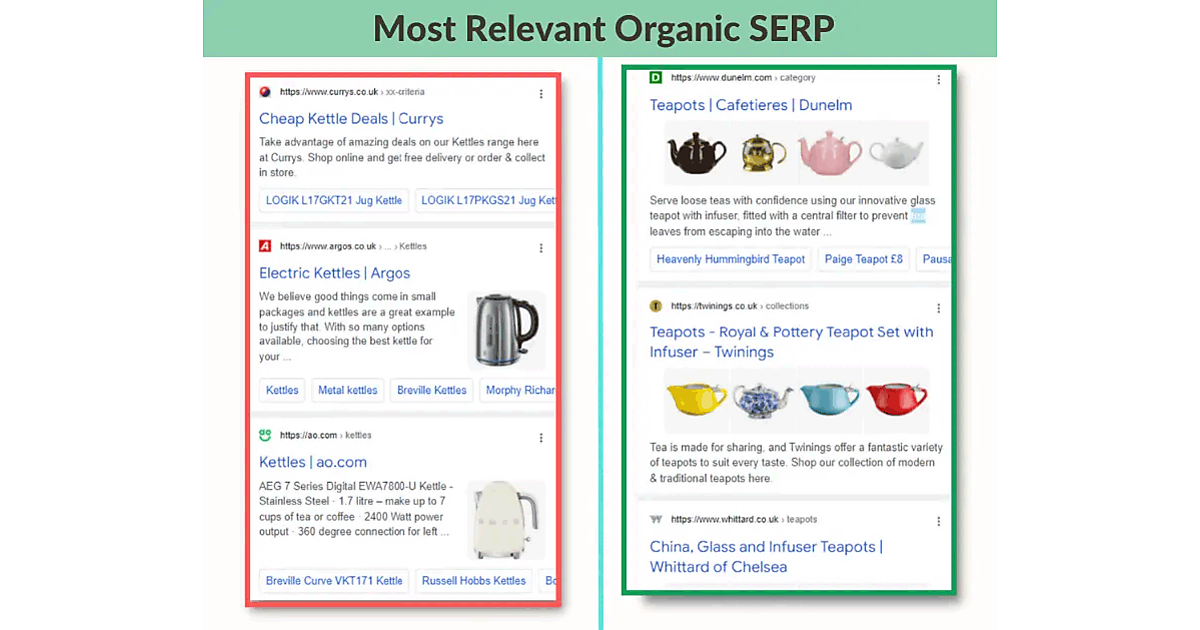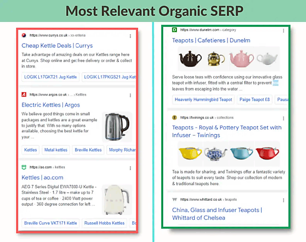 「やかん」も「ティーポット」も見た目は近いが、この2ワードのSERPを調べてみると、結果が明らかに異なることがわかる。後者の方がはるかにこの写真の物体に近いため、顧客のニーズを満たす可能性が高い。結果としてクリック率が高まり、サイト全体のSEO改善を牽引することも明らかだ。