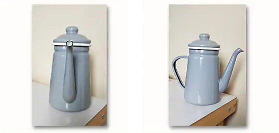 格好の例として、次の画像では同じホーロー製のティーポットを写した2枚の写真をグーグルのAIがどう解釈するかテストしてみた。