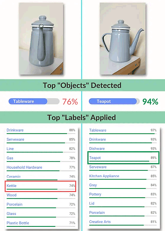 - ハンドルも注ぎ口も見えていない写真(左)は、76%の確度でTableware(食卓用食器類)と解釈。最も関連性の高い検索可能なラベルとして74%の確度でKettle(やかん)が追加された。