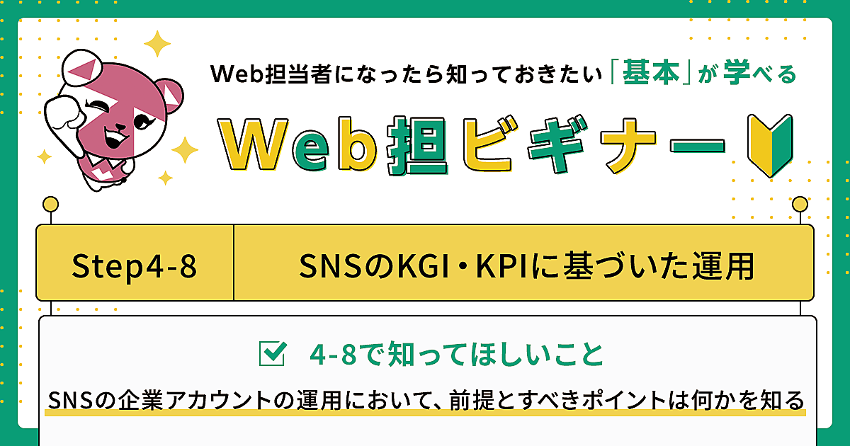 4-8では、SNSのKGI・KPIや各SNSの特徴など、運用の前提となるポイントを紹介します。