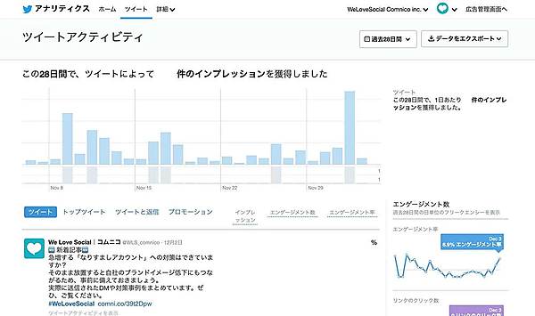 この画面では、ある1つのツイートがどれくらい他のユーザーに表示されたのか、「いいね」を押されたのか、リツイート(ツイートを再びツイートして、自分のフォロワーに共有すること)されたのか、エンゲージメント数などがわかります(過去28日分)。エンゲージメント数は、そのツイートに「いいね」したり、リツイートしたり、URLをクリックしたり、といった何かしら反応した数のことです。