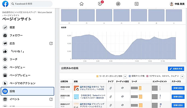 すると、次図のような画面が表示されます。左側メニューから確認したい項目を選べば、フォロワー数、[いいね]数、リーチ数だけでなく、かなり詳しい数値を確認できます。ページのファンがよく見る時間帯も知ることができるので、この情報から何時ごろに投稿すると良いかを判断することもできるでしょう。