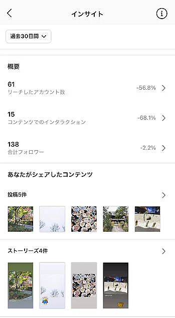 Instagramインサイトは、Instagramアカウントを作り、それをプロアカウント(ビジネスアカウント)に切り替えれば無料で提供されます。「インサイト」を選択すれば、次図のような画面が表示され、「リーチしたアカウント数(投稿を1回以上閲覧したユニークアカウント数)」「コンテンツでのインタラクション([いいね]などの反応数)」「合計フォロワー(フォロワー数)」が確認できます。該当の項目を選択すると、さらに詳しい情報を知ることも可能です。