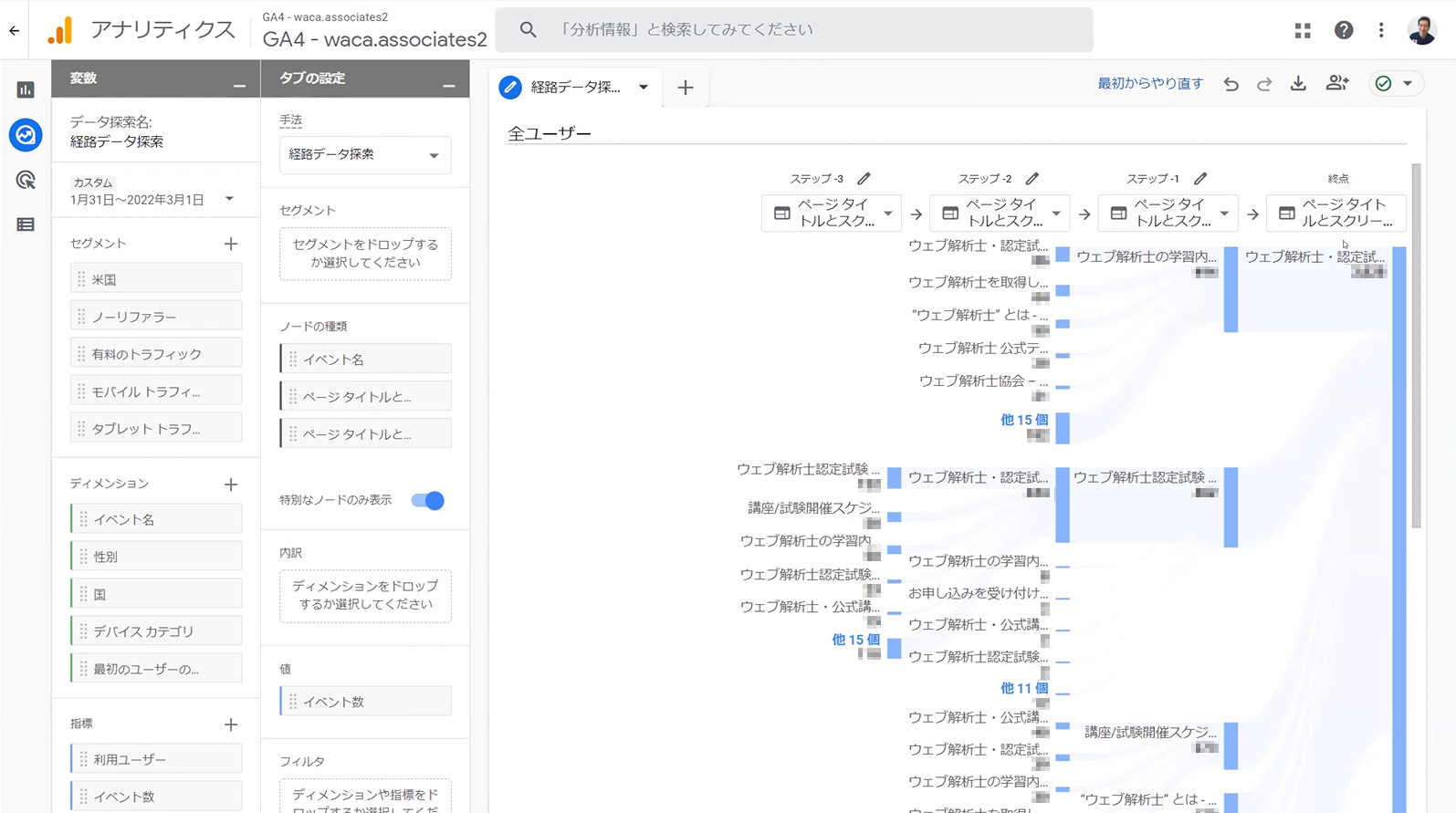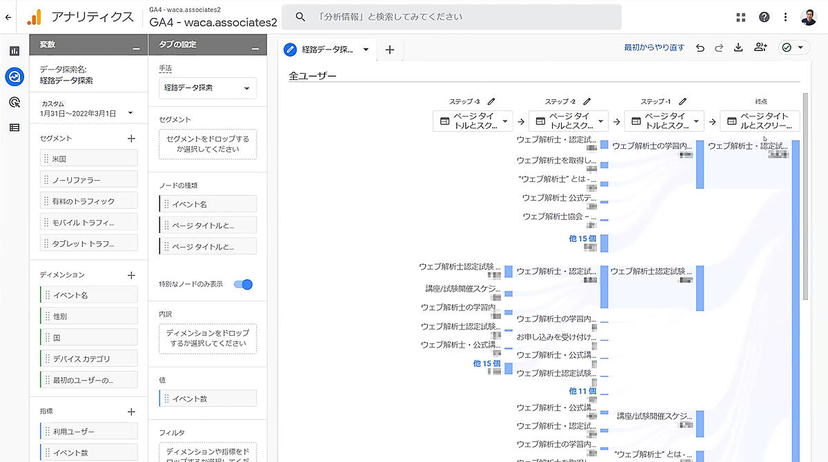 たとえば、ウェブ解析士の試験の申込みの例でいうと、試験申し込みをしたユーザーは、申し込みページ直前に「資格取得の流れ」を閲覧し、その前に「認定試験とは」を閲覧、さらにその前に「ウェブ解析士とは」を閲覧していることがたどれる。これにより、ゴールへのパスをするページが何か、ユーザーがどう動くと申し込みにつながるのかがわかる。実際に自分でその経路をたどってみると、このタイミングでこの情報を追加しよう、こういう文章に変えようというように、改善のポイントも見えてくる。