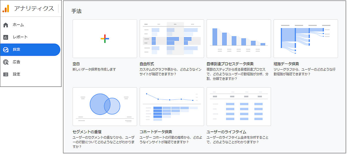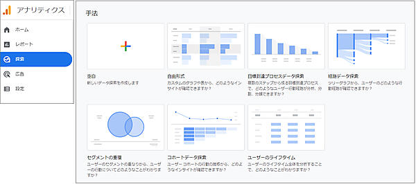 UAは、集客、行動、コンバージョンのレポートが充実しており、そこを見ておけばおおよそサイトの状態を把握でき、さらに調べたい場合は「カスタムレポート」で独自のレポートを生成できた。UAのカスタムレポートの延長にあるのがGA4の「探索」だ。探索には、「目標到達プロセスデータ探索」や「経路データ探索」などテンプレートは用意されているが、項目は自ら設定しないと何も表示されない。小川氏は、データ探索こそGA4の特徴だという。