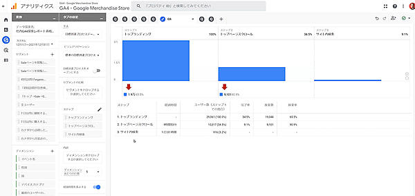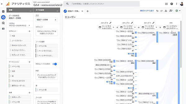 たとえば、トップページにランディングした後、トップページをスクロールして、サイト内検索するという流れを設定して、その行動をとった人をファネルで表示できる。ページ制作時に導線設計をしている人にとっては、その設計どおりにユーザーが動いているかどうか細かく検証できる。この機能はUAの有料版では設定できたが、GA4なら誰でも使えるようになっていることがすばらしいと絶賛する。