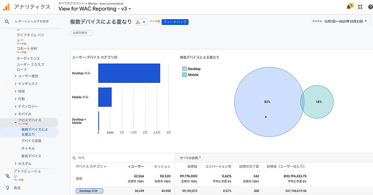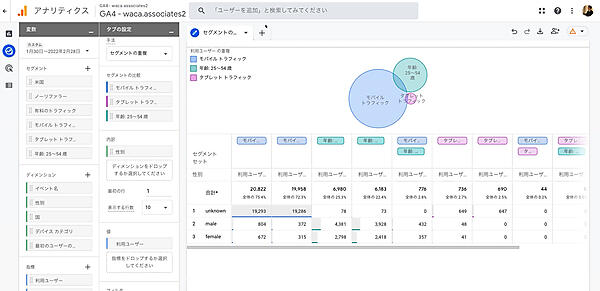 佐々木氏は、探索データの使い勝手を利点としてあげる。たとえば、「セグメントの重複」では、いろいろなセグメントの重なり具合を表示できる。UAでもクロスデバイスの重なりを見ることができたが、自分の好きなセグメントで重なりや分布を見られることをメリットに挙げた。