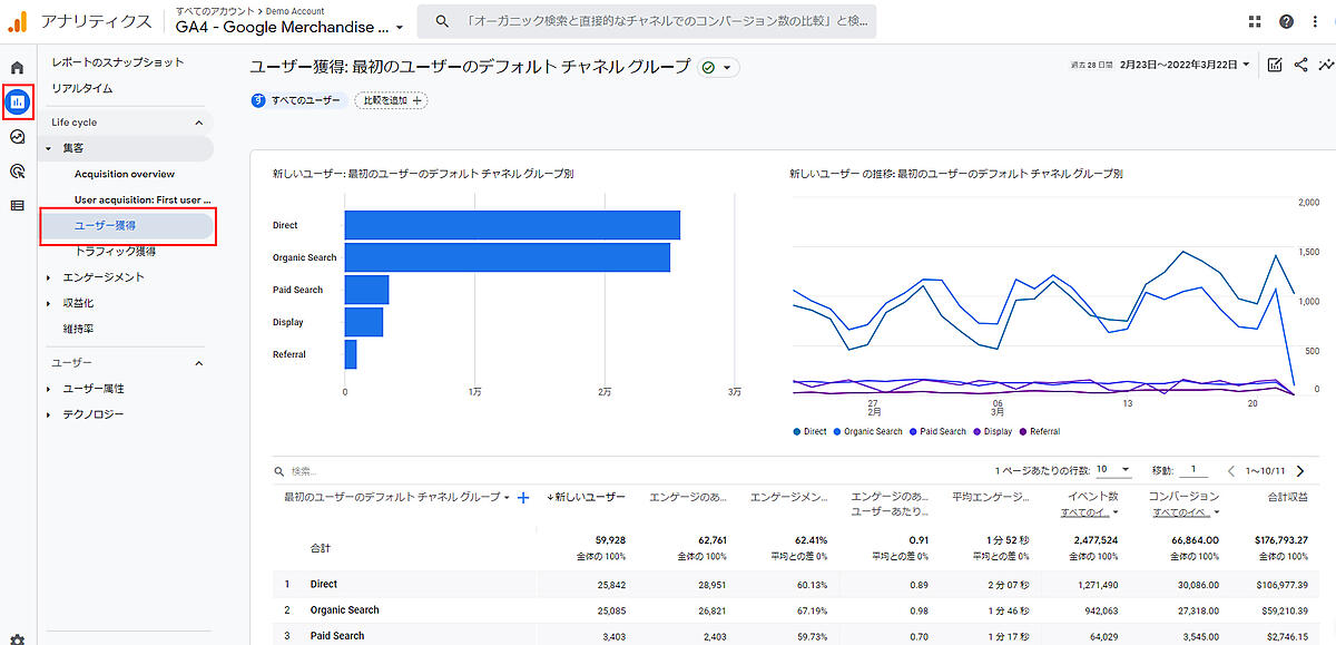 佐々木もう一つの変化は、ユーザー獲得についてです。UAは、集客で今回のセッションはどこから来たのかを確認できますが、GA4のユーザー獲得では最初にどこから来たのか、チャネル、参照元、広告キャンペーンなどを確認できます。LTVが高いユーザーやエンゲージメントが高いユーザーの最初の来訪きっかけを知ることができるようになっています。