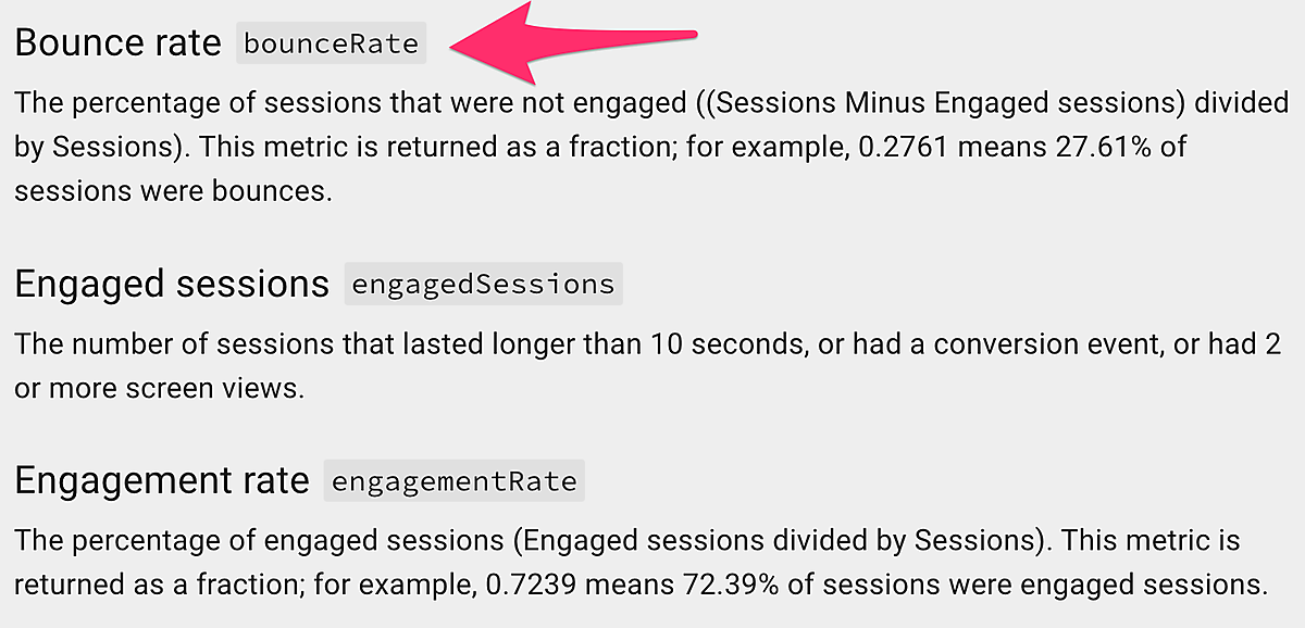 このツールでは、GA4で扱えるディメンションや指標をすべて一覧表示してくれるのだが、なんとそのなかに「Bounce rate」(日本語では「直帰率」)が含まれているのだ。