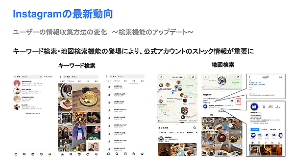 情報収集の主役といえばこれまではGoogle検索だったが、Instagram内での検索もユーザーは使いこなしてきている。Instagramの検索機能は年々強化されており、現在は2つ以上のキーワードを組み合わせて検索することが可能だ。また地図検索機能によって、現在地・指定地周辺の投稿も発見できる。