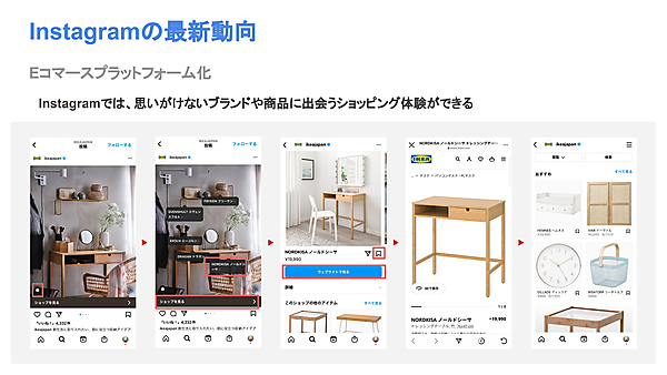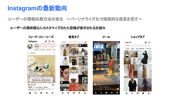 Instagramでは「発見型コマース」という概念が提唱されている。コンテンツのパーソナライズを駆使することで、ユーザーに“思いがけない商品との出会い”を創出し、購買に繋げようというアプローチだ。