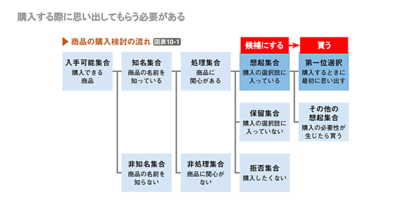 以下の図は、これまで一般的と考えられているユーザー行動モデルである。図左上の「入手可能集合」から右に向かって、商品をそもそも購入できるか、名前を知っているか、関心があるか等のフェーズを経て、購入にいたる。しかしその途中でふるい落とされる可能性もある。