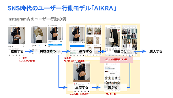 これをInstagramにあてはめるとどうなるか。ユーザーはレコメンドされた投稿や「発見」タブを通じて商品を認識し、興味があれば投稿の詳細を開いて中身を確認する。この次がユーザー行動の分岐点で、Instagram上の機能で「投稿を保存」するのが「Keep」、いいねを付ければ「Response」である。