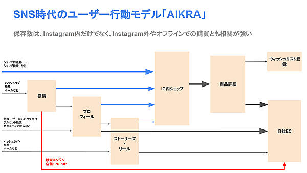 またInstagram上で各種マーケティング施策をおこなった場合、投稿内からのリンク・タップが増えるという直接的効果以外に、ユーザーがGoogleで製品名・ブランド名を検索したり、リアル店舗への来店者数が増えたりなど、別の指標に好影響を与えるケースがある。Instagram上の「保存数」は、そうした別指標とも連関性が高いとしている。